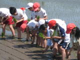 シニアクラブの皆さんから、苗の数や植え方を教えていただきながら、学校田の田植えを行いました。泥の感触を確かめながら、1本1本心をこめて植えていきました。 |