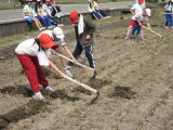 5年生の総合は、「米作りにトライ!」地域の田んぼの先生の指導を受け、みんなで、田起こしを行いました。鍬を使い、昔ながらの方法での田起こしは、なかなか大変でした。 |