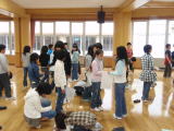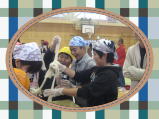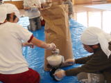 刈り取った後のわらも無駄にしなかった昔の人に習い、かかし作りに挑戦しました。「加治川桜盆栽会」の皆さんに教えて頂きながら、10体のかかしができました。11月の展覧会の時にお披露目します。力作を見て下さい。盆栽会の方には、「縄ない」や「ぞうり作り」も見せて頂きました。 |