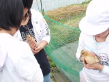 アイガモ農法を実践されている農家の方の田んぼを、見学させていただきました。アイガモ農法の良さをお聞きした後、実際にひなを抱き、田んぼに放すお手伝いをさせていただきました。 |