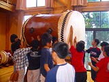 大きな太鼓に感激!太鼓をたたくと振動で体中が震えました。太鼓を教えてくださったのは、「鼓堂」のメンバーの「しんちゃん先生」。エネルギッシュな動きと明るく元気な話し方は、たちまちみんなを惹きつけてしまいました。この後、一人一人が太鼓をたたき、汗びっしょりになるまで楽しみました。けっこう体力がいるかも・・・。 |