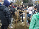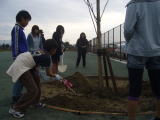 「桜の里づくり」の会の方から桜の木を寄贈してもらいました。そこで、6年生の有志が集まって植樹会に協力しました。すてきなグラウンドに桜の若木が2本植えられました。子どもたちは、スコップに土をすくい、ていねいに桜の木の根元にかけていました。卒業しても、この桜の木はずっと自分たちを見守っていてくれるということを励みにして植樹会は終了しました。 |