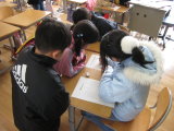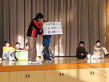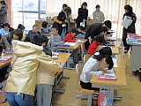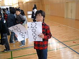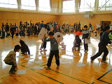 全校のみんなに楽しんでもらうために、児童会の運営委員会主催の「桜っ子グループ(全校縦割り班)対抗・新春カード合わせゲーム」が行わわれました。 たくさんの大きなカードが体育館の中央に裏返しで広げられています。グループから順に1人2枚ずつカードを拾い、絵が同じだったらもらえるというゲームでした。どこにどの絵があるのかを覚えておくことが勝負の決め手でした。 |