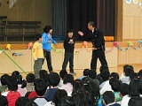 学校に不審者が侵入したという想定で、警察の方の御指導の下、避難訓練が行われました。 不審者から避難する子どもたちはもちろん、子どもたちを守るために避難誘導する担任も、不審者役の警察の方に対峙する学校職員も、真剣な表情で避難訓練を行っていました。 その後、体育館で道路を通行中に不審者に呼びかけられた時の声の出し方を練習しました。 |