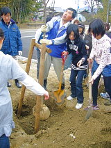 6年生による、第1回卒業記念の桜の植樹が行われました。地域の造園業の方が、植樹の方法を子どもたちに教えてくださいました。 |