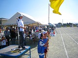 | 低学年の徒競走は50Mでした。1,2年生は、自分のコースをまっすぐに走り切る練習をしてきました。子どもたちは、ゴールを目指して全力で走りました。 | |