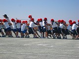 学校が統合して、全校児童が331名になりました。全校児童が綱一本に集中して引っ張り合いました。1勝1敗の同点で迎えた最後の対決は、赤組に軍配が上がりました。 |