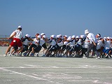 午前最後のプログラムは1〜3年生の選手によるリレーでした。各クラスの足自慢が集まって、風のようにビュンビュン走り、1つのバトンをつなぎます。4色対抗のリレーは、白組の1位、2位を独占しました。 |