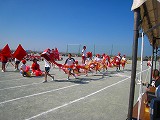 午後の部、最初の競技は赤白対抗の応援合戦で、各組10分間の応援を行いました。 赤組はドラゴン、白組はライオンをイメージして応援しました。応援の声、パフォーマンスの工夫、息の合った応援を競い合いました。 赤組はペットボトルをつないで作ったドラゴンの舞、白組はビニール傘にライオンのような飾り付けをしたパフォーマンスと、応援に工夫が見られました。 |