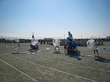 加治川小学校の縦割り班は、「桜っ子グループ」といいます。この種目は、その桜っ子グループで行う種目でした。ふつうのムカデ競走は両足ですが、この種目はもっと難しい片足で行い、さらに途中にあるゴムの障害を乗り越えました。 息を合わせて前進するのはもちろん、足ひもを結ぶときに高学年が低学年の世話をする姿が見られました。 |