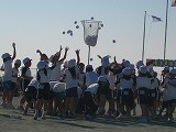 運動会のすべての競技が終わり、閉会式が行われました。 最初の優勝旗は、午前中の競技で奪ったリードを守りきった白組の手に渡りました。応援賞は、赤白甲乙つけがたく、審査員の評価が分かれましたが、わずか1点の差で赤組に軍配が上がりました。 1日の熱戦が終わって、応援団の解散式が行われました。その後、応援団のこれまでのがんばりをたたえるサプライズイベントが行われました。 |